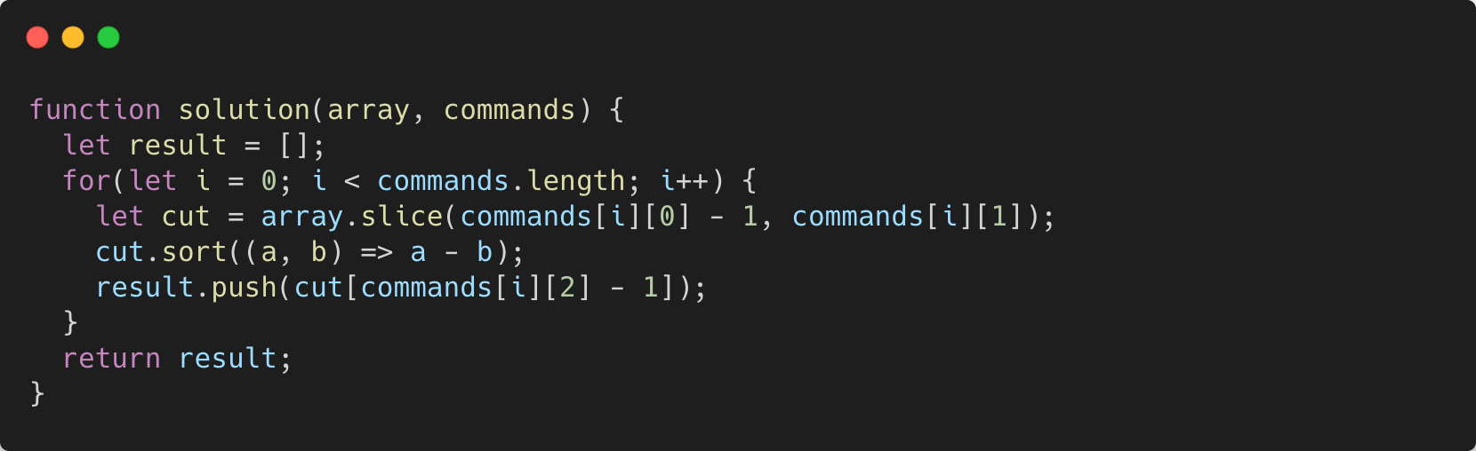๋ฐฐ์ด array, [i, j, k]๋ฅผ ์์๋ก ๊ฐ์ง 2์ฐจ์ ๋ฐฐ์ด commands๊ฐ ๋งค๊ฐ๋ณ์๋ก ์ฃผ์ด์ง ๋, commands์ ๋ชจ๋ ์์์ ๋ํด ์์ ์ค๋ช ํ ์ฐ์ฐ์ ์ ์ฉํ์ ๋ ๋์จ ๊ฒฐ๊ณผ๋ฅผ ๋ฐฐ์ด์ ๋ด์ ๋ฆฌํดํ๋๋ก ํจ์๋ฅผ ์์ฑํด ์ฃผ์ธ์.